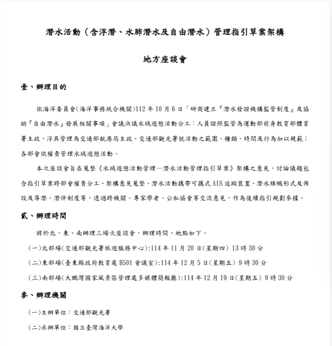 一、本次座談會旨在蒐整「水域遊憩活動管理—潛水活動管理 指引草案」架構之意見,討論議題包含指引草案跨部會權 責分工、架構意見蒐整、潛水活動攜帶可攜式AIS追蹤裝 置、潛水旗幟形式及佈設及導潛、潛伴制度等議題。本署預計於北、東、南部辦理座談會,希冀藉由跨機關、專家 學者、公私協會等交流意見,作為後續指引規劃參據。