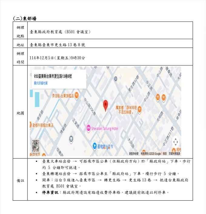 (二)東部場(臺東縣政府教育處B501會議室):114年12月5 日(星期五) 10時(9時30分開始報到)。