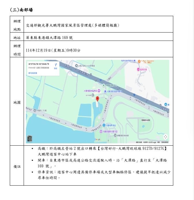 (三)南部場(交通部觀光署大鵬灣國家風景區管理處多媒體簡報廳):114年12月19日(星期五)10時(9時30分開 始報到)。