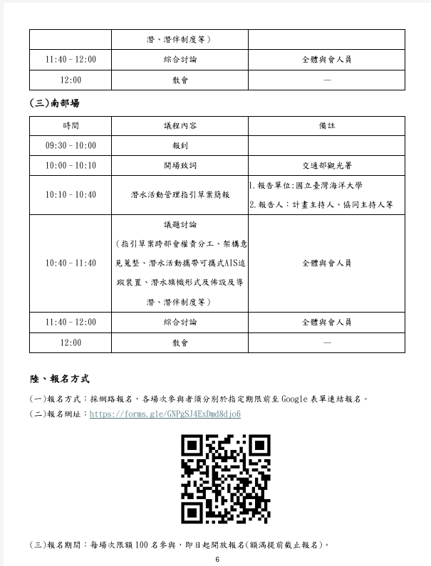 交通部觀光署舉辦「潛水活動(含浮潛、水肺潛水及自由潛 水)管理指引草案架構地方座談會」報名說明資料1份, 歡迎各位先進踴躍報名參加。